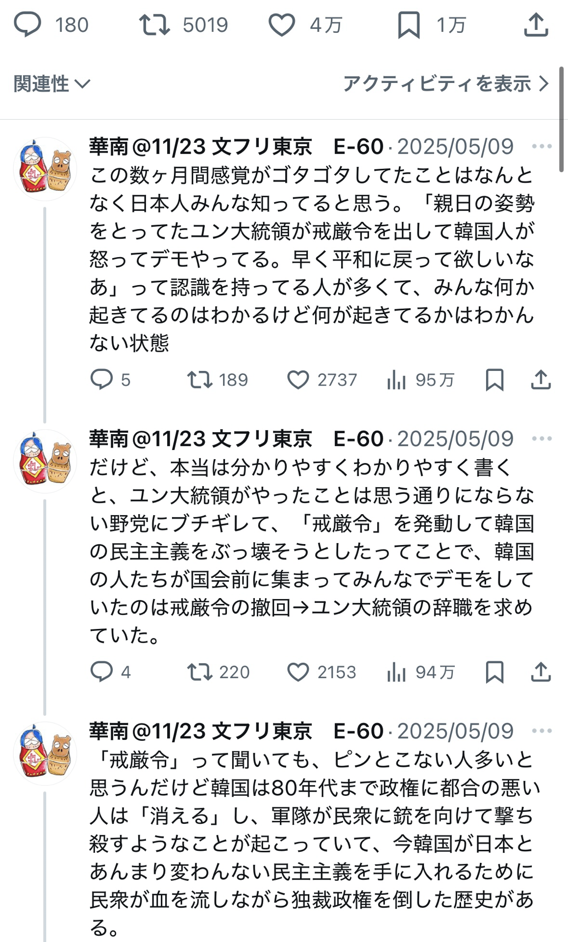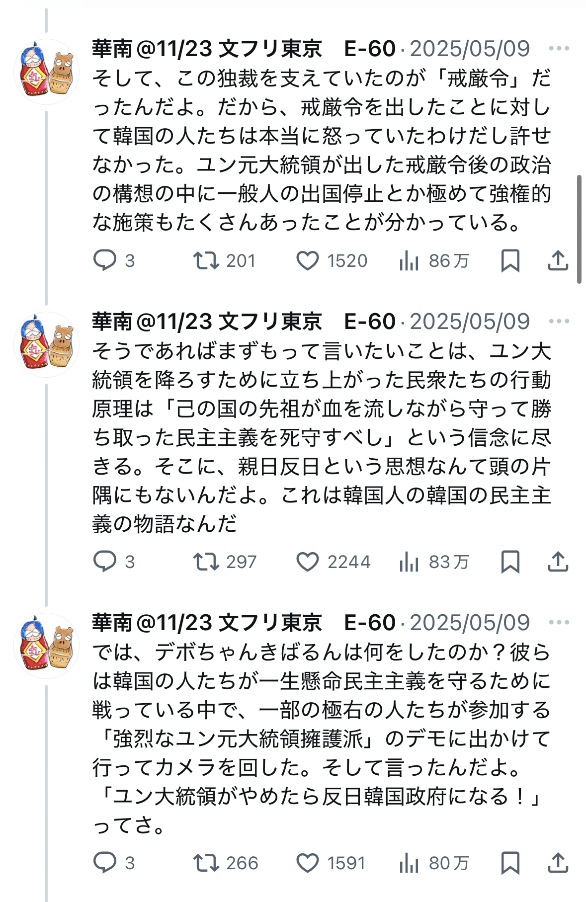「私は日本と韓国が仲良くしてほしいから、反日政権が立たないように尹大統領を応援するんだ!」