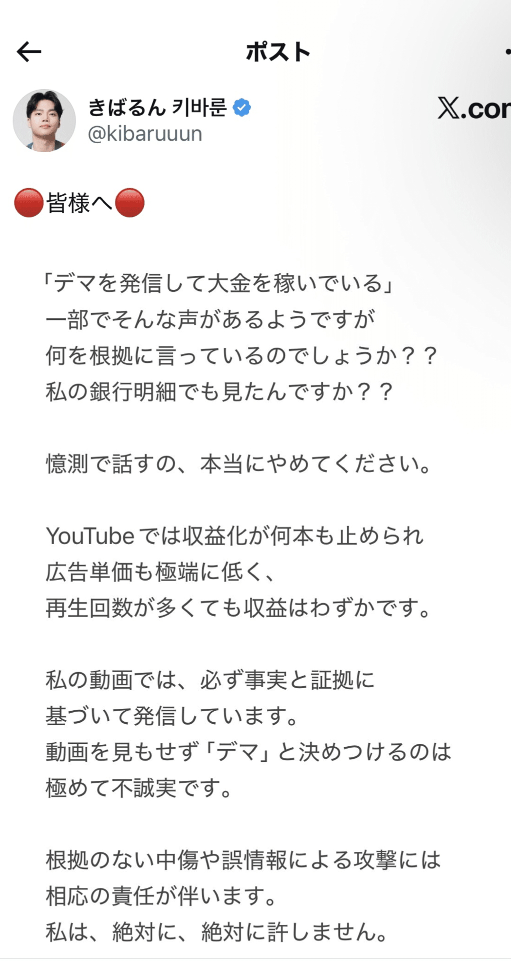 これ以上は我慢ができないと思って、私はX上でデボちゃんとそのお友達のきばるんのやってることが、フェイクニュースのばらまきであり彼らが言ってることは出鱈目であるということを主張することを書いた。