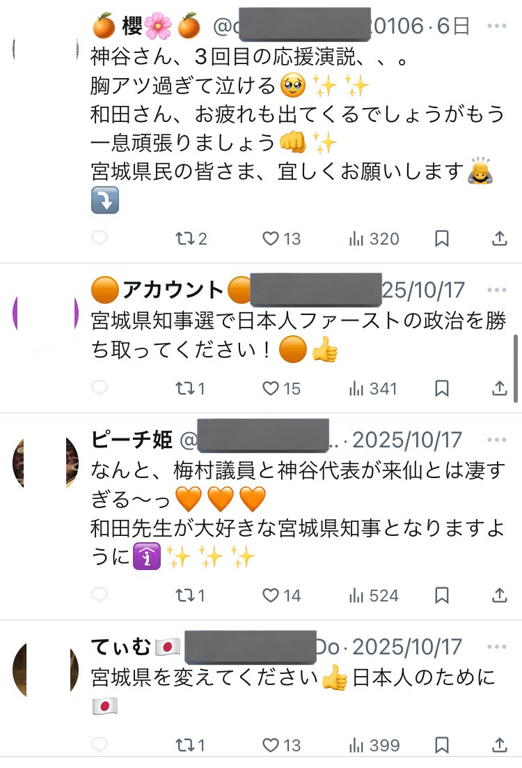 また、選挙期間中に「宮城県知事選」というワードで検索すると、X(ツイッター)に出てくるのはオレンジ色の記号のついたアカウントばかり。