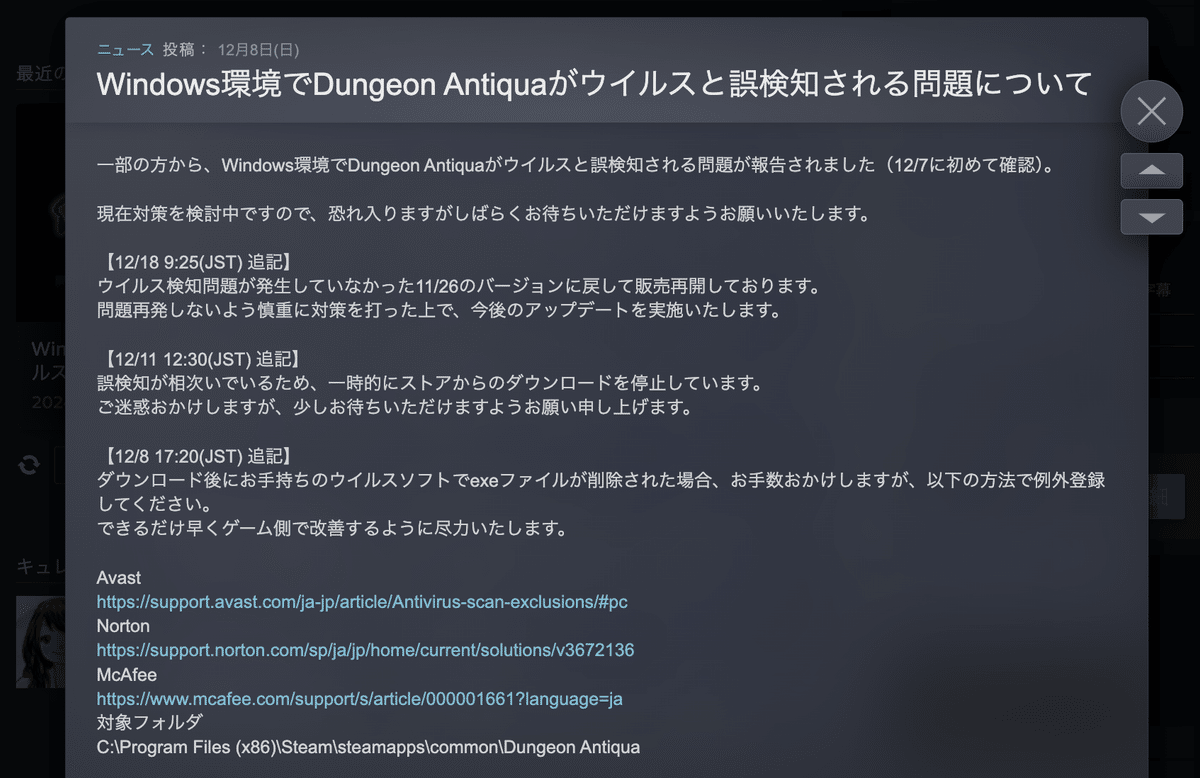 12/11早朝、Steamサポートから「あなたのゲームがウイルスであるという報告が複数寄せられたため、販売を停止した。対策をとらない場合ストアから削除することになる」という連絡が来た。