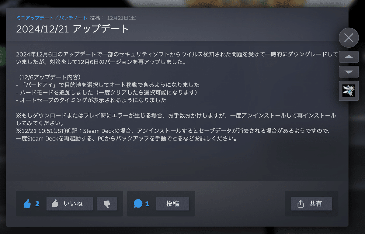 12/6アップデート以降、ウイルス検知発生のXのポストなどを見かけるようになる。調べるとPyInstallerでexe化したファイルにはありがちなことらしい(詳しくは次項)。とりあえず連絡が取れた方にウイルス検知からの除外設定を個別にお願いしたり、Steamにお知らせを掲示したりした。