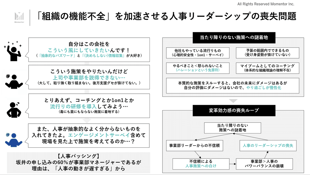 そうなると、下記の図のように、「組織の機能不全」を加速させる人事のリーダーシップの喪失問題が発生し、「組織施策の人事パッシング=人事を通さずに事業部が個別でプログラムを導入する等」の流れも生じていきます。