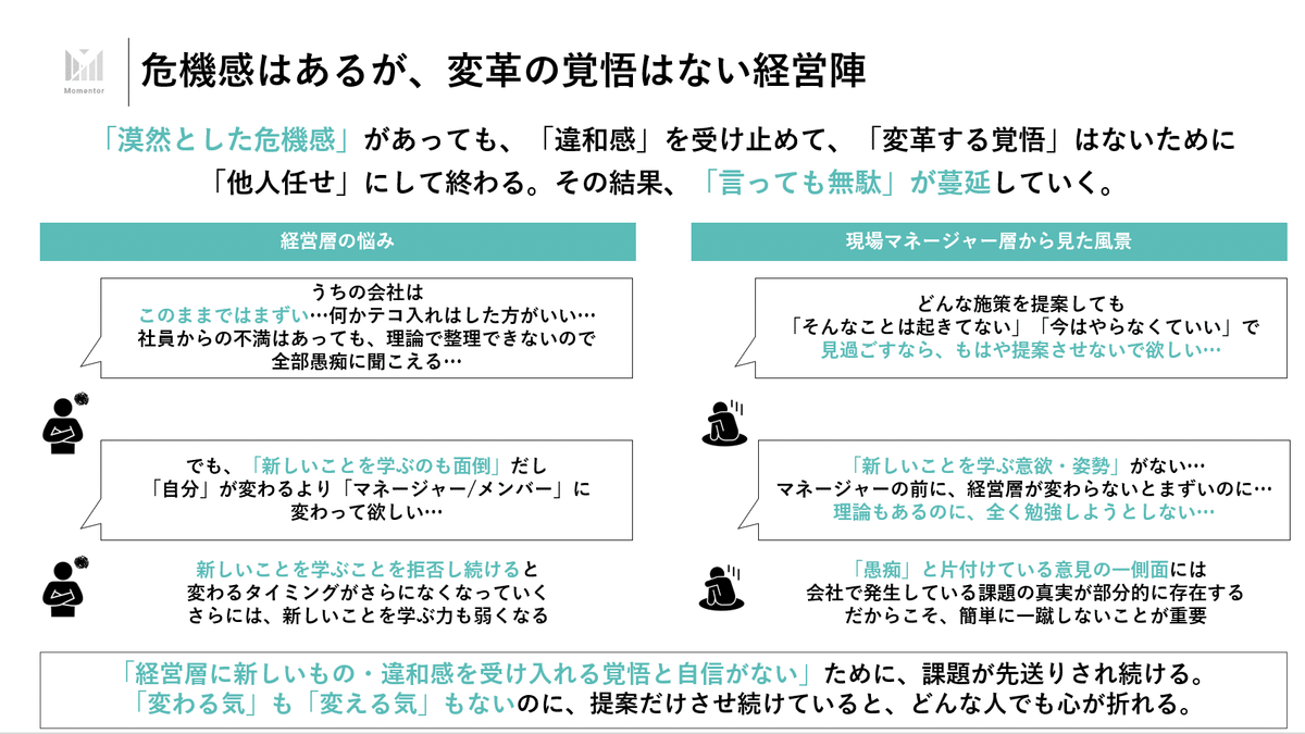 また、「情報収集だけは無限に行っているが、特に施策を決断・実行しない人事」というのは、よく見る光景かもしれませんが、そもそも人材育成・マネジメント領域の課題は、巻き込み難易度が高いために、並大抵のリーダーシップでは挑みにくい課題になっている、という話なのだろうと推察しています。