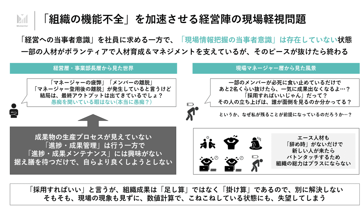 ただし、経営サイドにも問題があり、「うちはマネージャーも人事も機能していない」という話は、すなわち「経営が機能してない」にほぼ等しいので、ブーメランだなと思います。