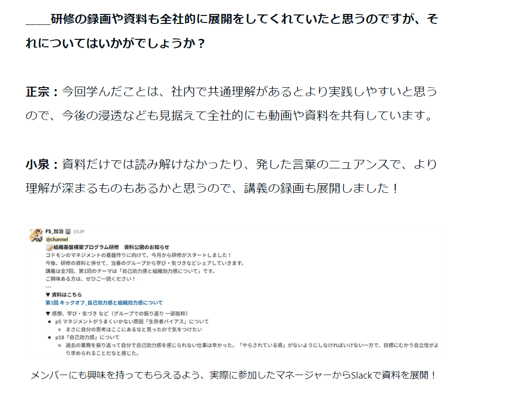 実際に、坂井のご支援先であり、とんでもなく社会的意義のあるプロダクトを作っているコドモンさんも、下記の記事キャプチャの通り、研修の録画・資料を全社的に展開くださっています。坂井としても、これが理想だと思っています。