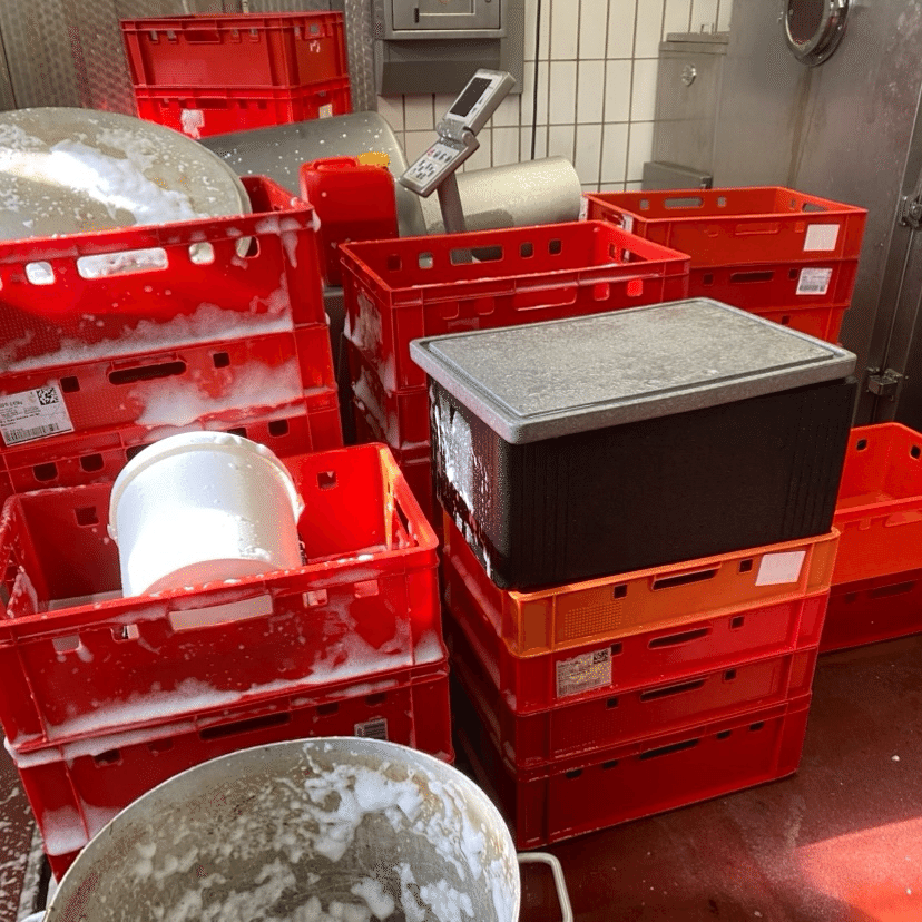 その日使った機械・道具・箱…全てに洗剤をぶちまけ、ホースにつないだガンスプレーを使い『熱湯で』洗い流す