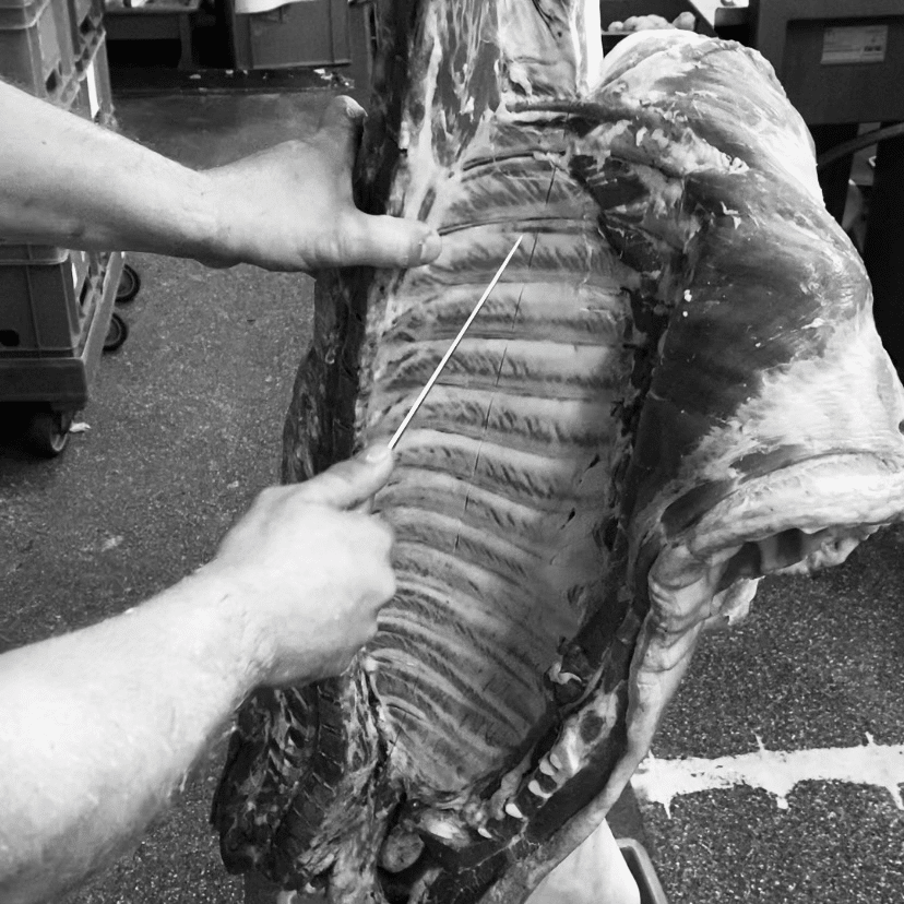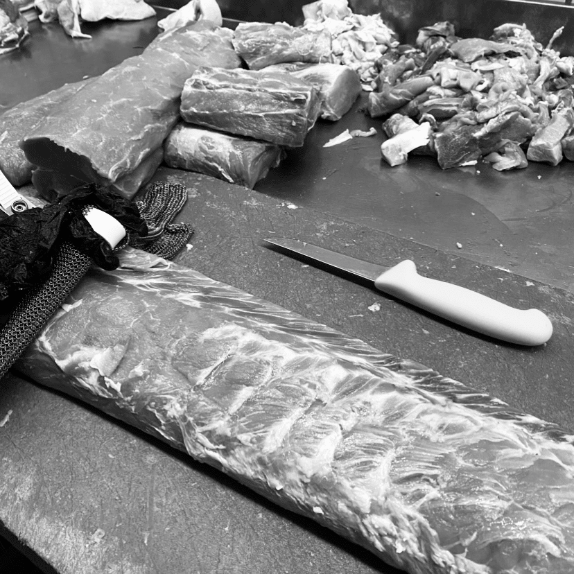 豚の半身の解体作業中、この頃には毎回ノートを開いたりスマホで動画を確認しなくても、少しずつ自分だけで進められるようになっていた