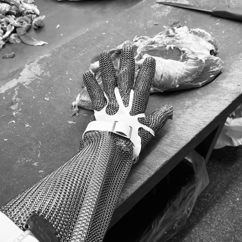 朝食後の作業前、肉屋がつけるチェーンで出来た重いエプロンを着るのに私が手こずっていたら男の子たちが周りに集まって来た