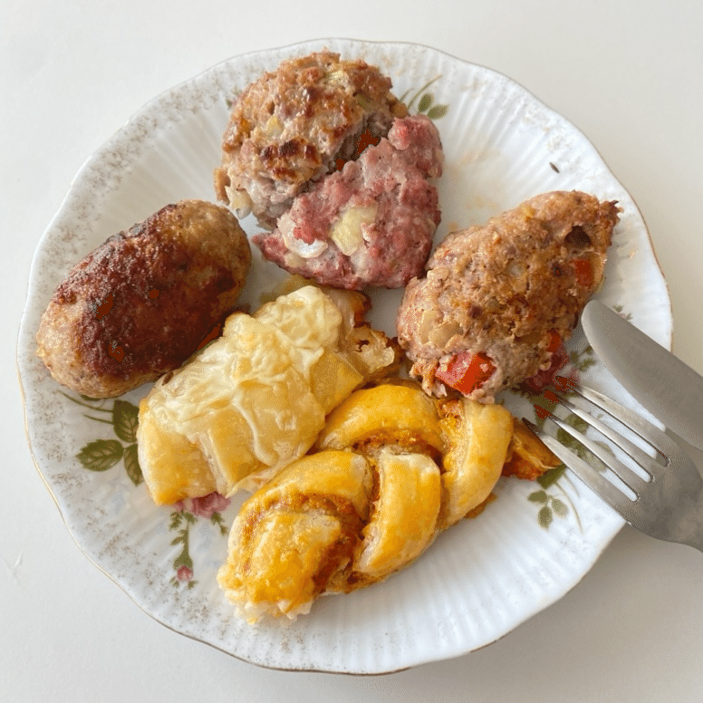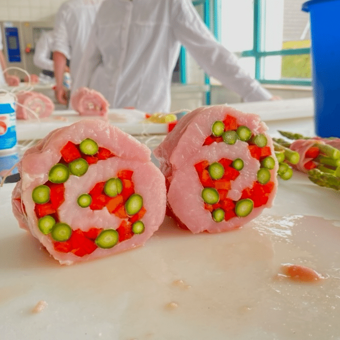 4月の職業学校ではひき肉を使った料理を班ごとに作ったり、Rollbraten(ロルブラーテン)という豚の首肉を開いて平たくしたものに野菜や香辛料などを撒いてオーブンで焼く伝統的な料理を作ったりした
