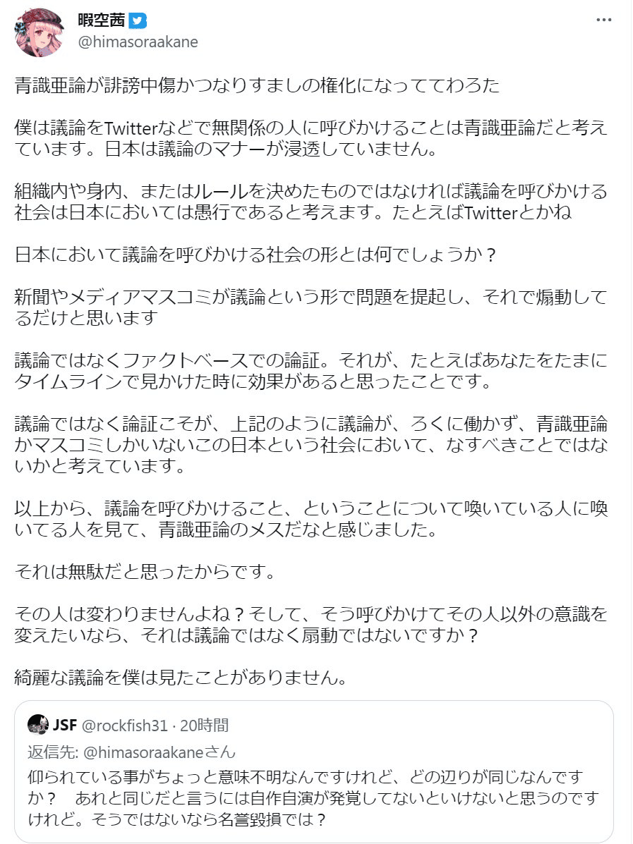 そうすると、まずこのJSFという人が、「青識亜論にたとえるなんて名誉毀損だ!」とタックルしてきましたが、基本的にレスバになると短文でしかレスできない低知能で、飽きたとかいって去りました