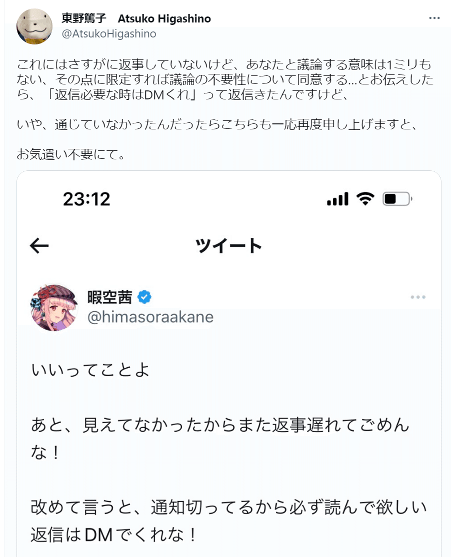 東野篤子さんの理解 「返信必要なときはDMくれ」