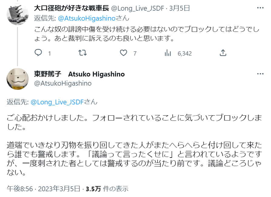 Twitterでリプされることを「刃物を振り回され刺された」 Twitterでフォローされることを「つきまとわれて恐怖を感じる」 議論(笑)をもちかけられることを「殴りつけて鼻血を吹き出させること」 東野篤子さんはTwitterするにはナイーブすぎます Twitterやめろ(笑)