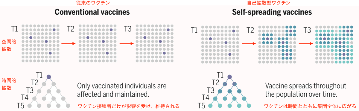図の説明をします。時刻T1において4人がワクチンの接種を受けたとします。従来のワクチンでは免疫を得るのはワクチンを接種した当人だけです。しかし自己拡散型ワクチンの場合には、直接ワクチンを接種していない人達にも免疫が間接的に伝わって広がります。自己拡散型ワクチンの拡散は、空間的にも時間的にも起こり得ます。集団全体への迅速なワクチン接種を施したい人達にとっては自己拡散型ワクチンはある意味魅力的なのでしょう。しかし大きな問題として、個人の意思や希望とは無関係に、つまり本人が気が付かないうちに、ワクチン接種を受けたくない未接種者までもが「ワクチン接種」を強制的に受けさせられてしまう状態になるという事態が起きる恐れがあるのです。