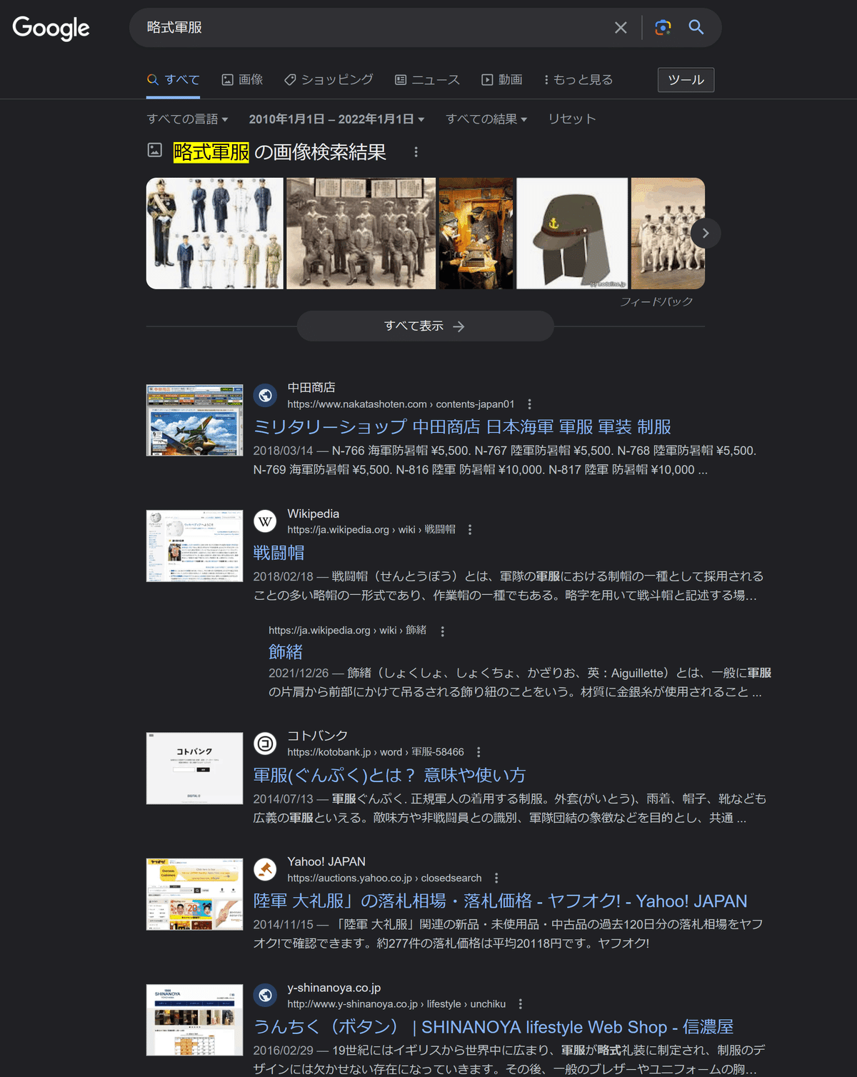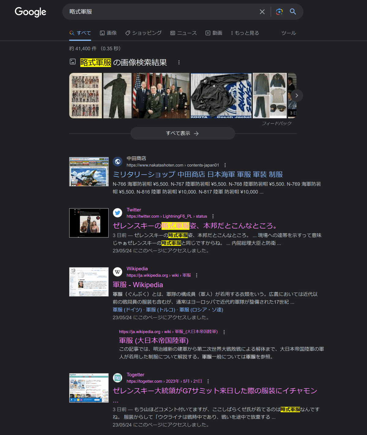 だが、一般サイトで「略式軍服」という言葉が使われていなくても、特定の界隈・ソーシャルで使われている専門用語の可能性は否定できない。