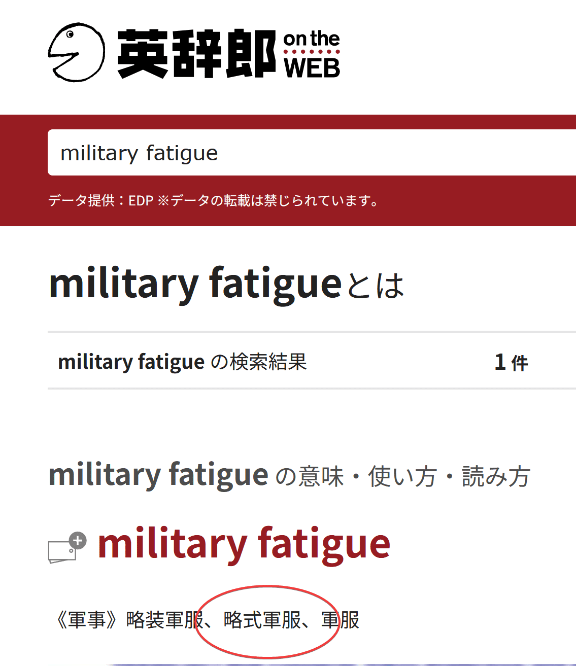 念のため調べてみたが、やはり”military fatigue”を略式軍服と訳している辞書・サイトは英辞郎以外に存在しない。当然である。そんな日本語はないのだから。