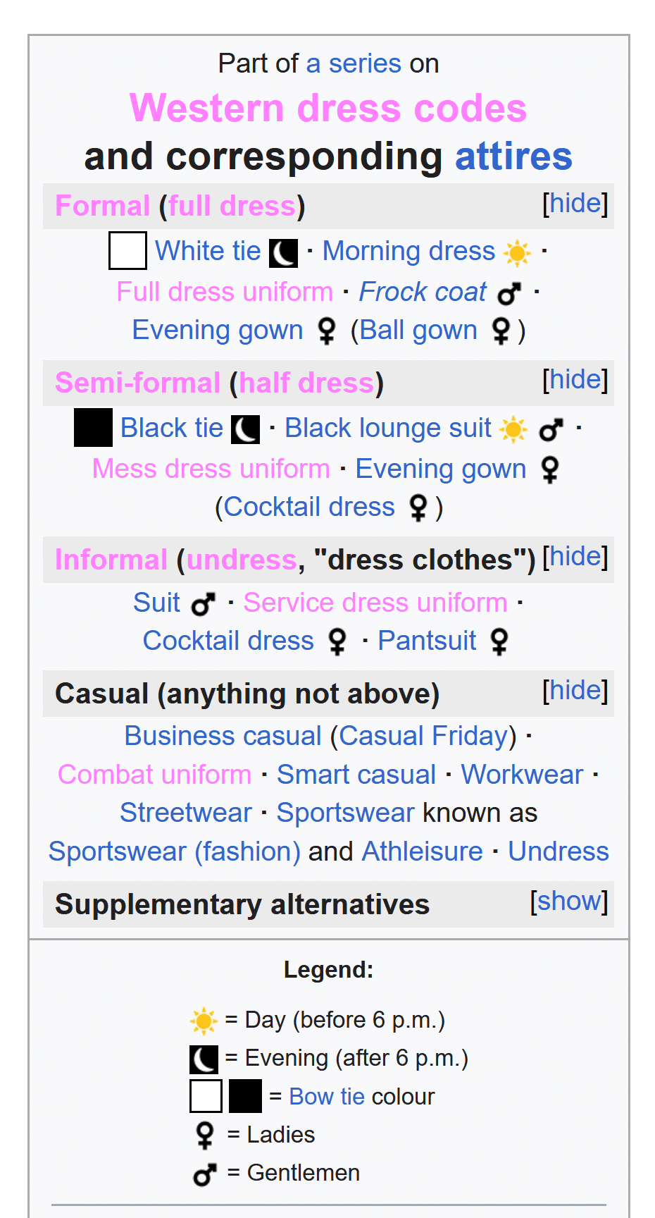 余談だが、informalと呼ばれているのは日本語にすると「略礼装」である。そもそも「略礼服」の時点で”フォーマル”ではないのだ。あと、日本の略礼服はガラパゴス概念だという指摘もある。海外の式典に参加される方は気をつけてもらいたい。