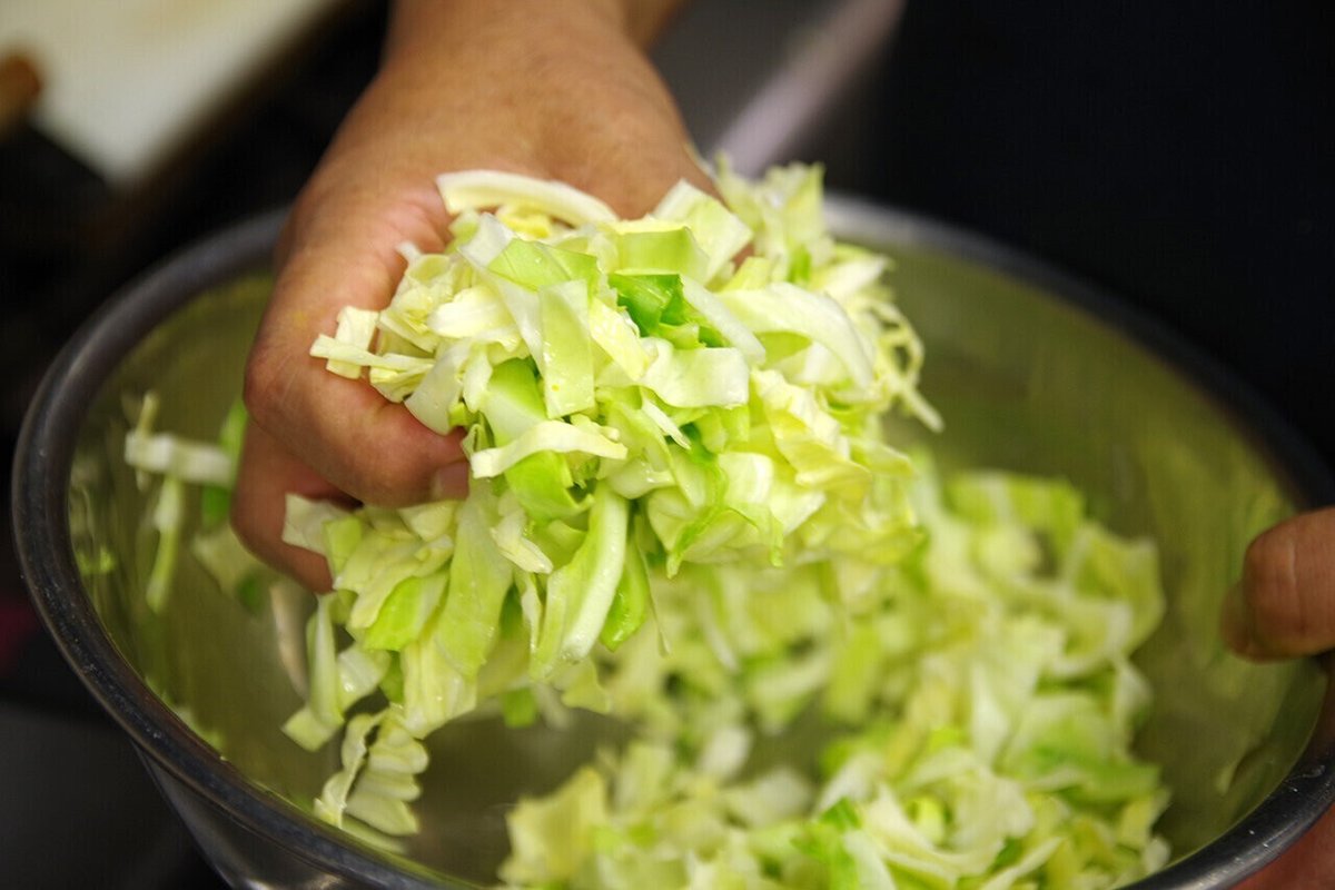 1.(A)のキャベツを1センチ幅に切って、塩で揉んで30分置き、軽く絞っておく。