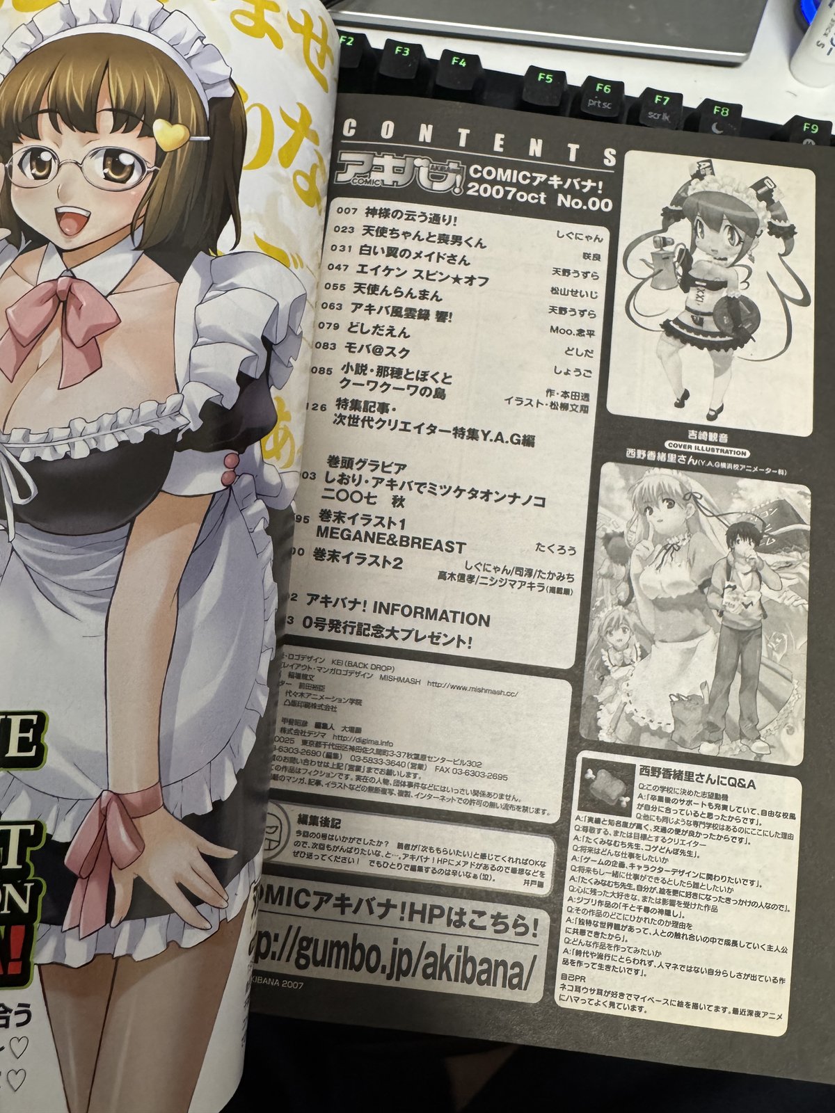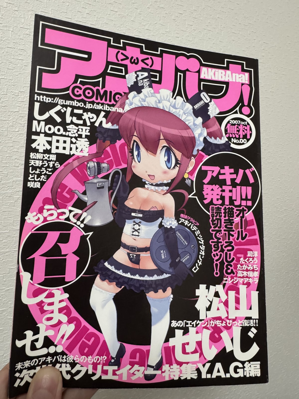 「アキバ発刊」をアピールするこの「アキバナ!」、そもそもは「コミック・ガンボ」の姉妹誌という立ち位置だったようだ。2007年1月に創刊した「ガンボ」は定価0円のフリーペーパーで、世界初の無料週刊漫画誌を謳っていた。それで資金繰りがうまくいっていたのか!? と心配になるが、普通にうまくいっていなかったらしく、創刊から1年足らずの2007年12月に廃刊となっている。「アキバナ!」も「ガンボ」の流れを汲んだ無料漫画誌であり、秋葉原近辺で配布されていたという。