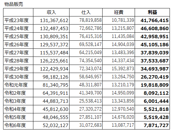 決算書類上では販売品売上による収入と販売品仕入・販売経費による支出に分けられ、その差額を利益として見る事ができます。