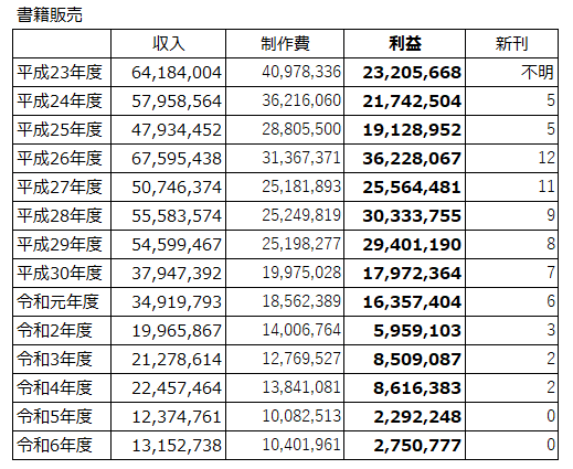 なお、電子書籍も別項計上されていますが年間収入が100万前後しかないので省略しています。