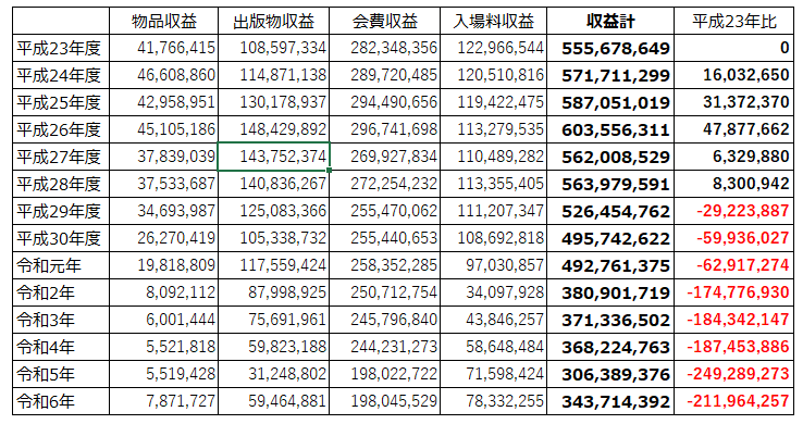 なお、幽玄の間会員と思われる利益は平成29年度まで事業利益「インターネット」、それ以降は受取会費「インターネット会員」として集計されているようなため列を分けています。