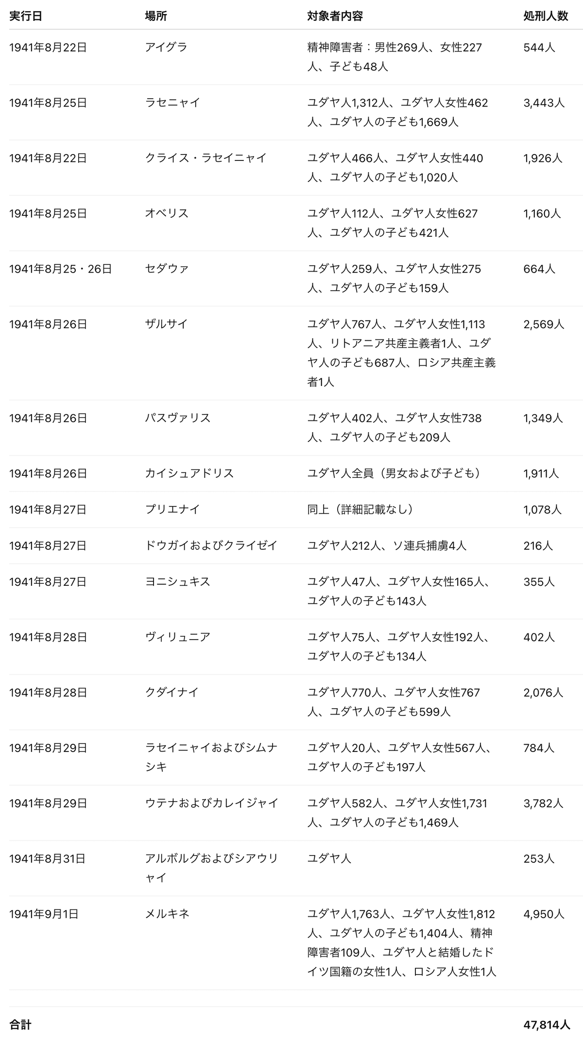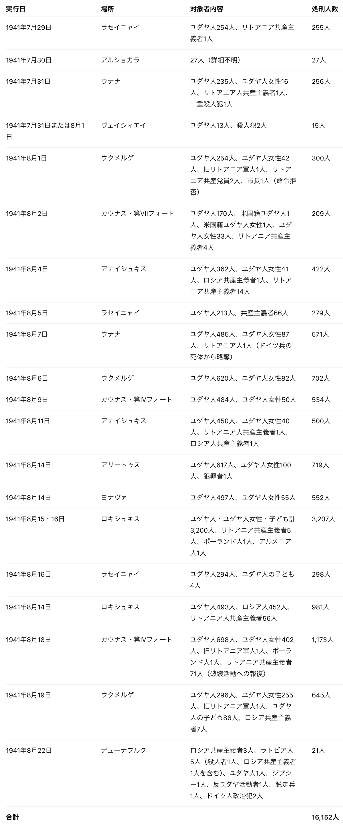 以上がイェーガー報告書と呼ばれる文書の翻訳全文です。ホロコースト否認派以外の人で、この報告書に疑問を持つ人はいるのでしょうか? もちろん、重大な歴史文書であり、また翻訳の最初の方にあった裁判などの法的現場でも使われる文書なので、しっかりと精査されており、疑問の余地はないと考えるべきでしょう。イェーガー大佐率いるアインザッツコマンド3の部隊は、担当したリトアニアのユダヤ人及び少数の非ユダヤ人を1941年7月4日から1941年11月25日までの間に、137,346人殺し(ベラルーシの約3,000人含む)、「リトアニアでは、労働ユダヤ人以外のユダヤ人は、その家族を含めてもういない」状態にしたというわけです。145日間ですから、1日につき平均で約千人を殺害して回ったことになります。
