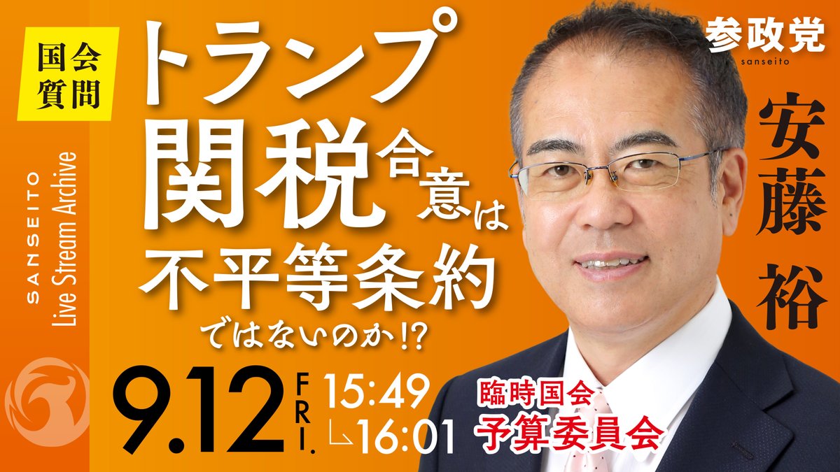 【国会 9/12】 トランプ関税合意は不平等条約ではないのか!?|参政党・安藤裕