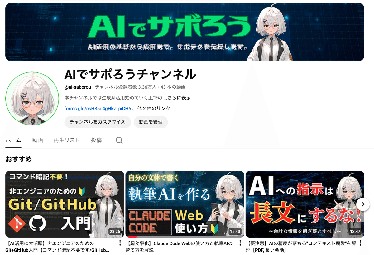 運営しているのはこちらのAIでサボろうチャンネルで、開始から9ヶ月経った現在、登録者数は3.3万人!AIというホットな話題に乗っかってるからではありますが、かなり速いペースで成長できています。