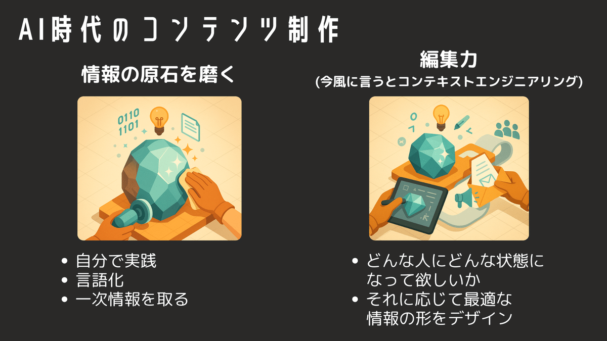 今、私はメインに活動しているのはYouTubeの動画メディアしかありません。ですが、AI時代はコンテンツの原石を磨けば、様々な形に展開することができます。