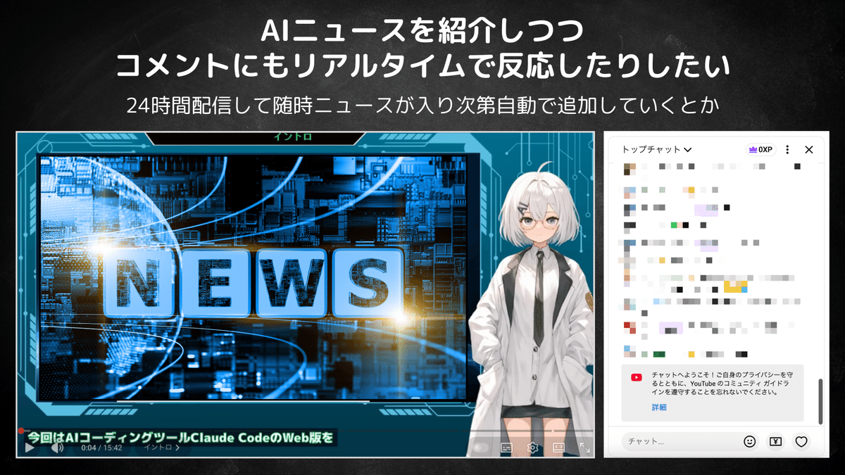特にやりたいのがライブ配信で、今のAIでサボろうチャンネルでは動画しか出していないのですが、このサボルちゃんというキャラクターがニュースを解説しつつ、ユーザーからのコメントにも反応する、そんなインタラクティブな体験を作っていきたいと考えています。あとLive2Dとかでもっとしっかり動くようにしたいですね。