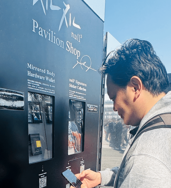 QRコードからオンラインで決済する。決済したらスタッフの人を捕まえると商品がもらえる。