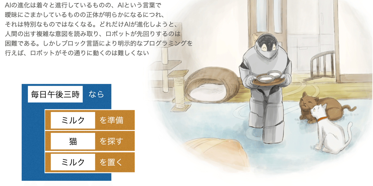 プログラミングを学ぶということは機械との付き合い方を学ぶということに他ならない。機械の方からの歩み寄りもあるが、人間はやがてAIとの意思疎通をするために結局は全員がプログラミングを学ぶ必要があるだろう。