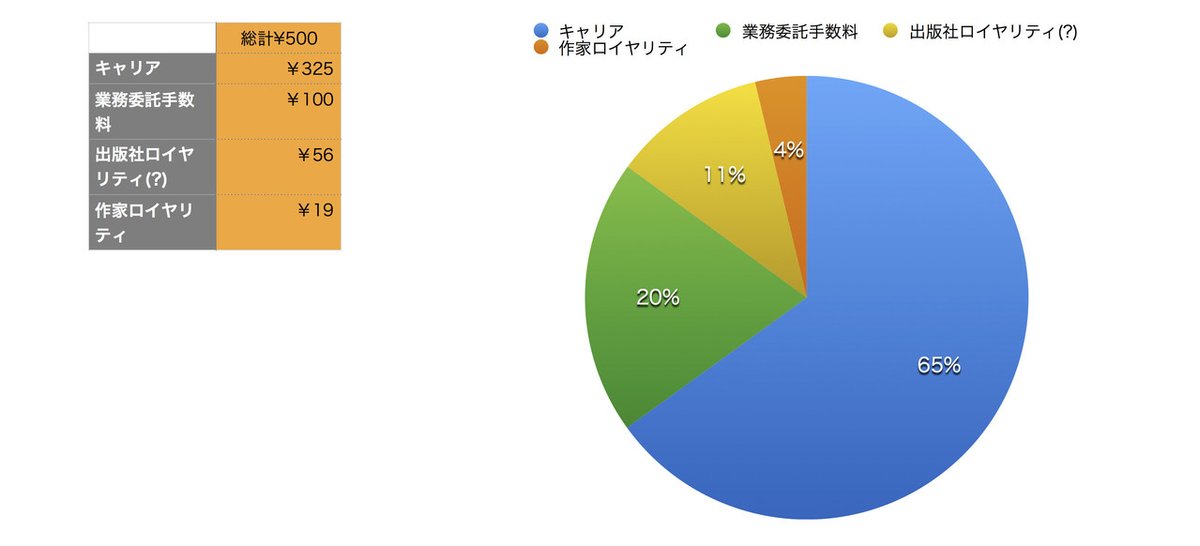 キャリア(ストア)の手数料はAppleであれば30%、Kindleであれば65%と(高いけれども)固定されており明確ですが、出版社の手数料は内訳が作家に知らされていない場合が多く、先ほども書いた通りブラックボックスです。悪い受け止め方をしてしまうと、手数料を高めに設定してしまえば、作家の受け取るロイヤリティは5%よりさらに低くなる可能性もあります。