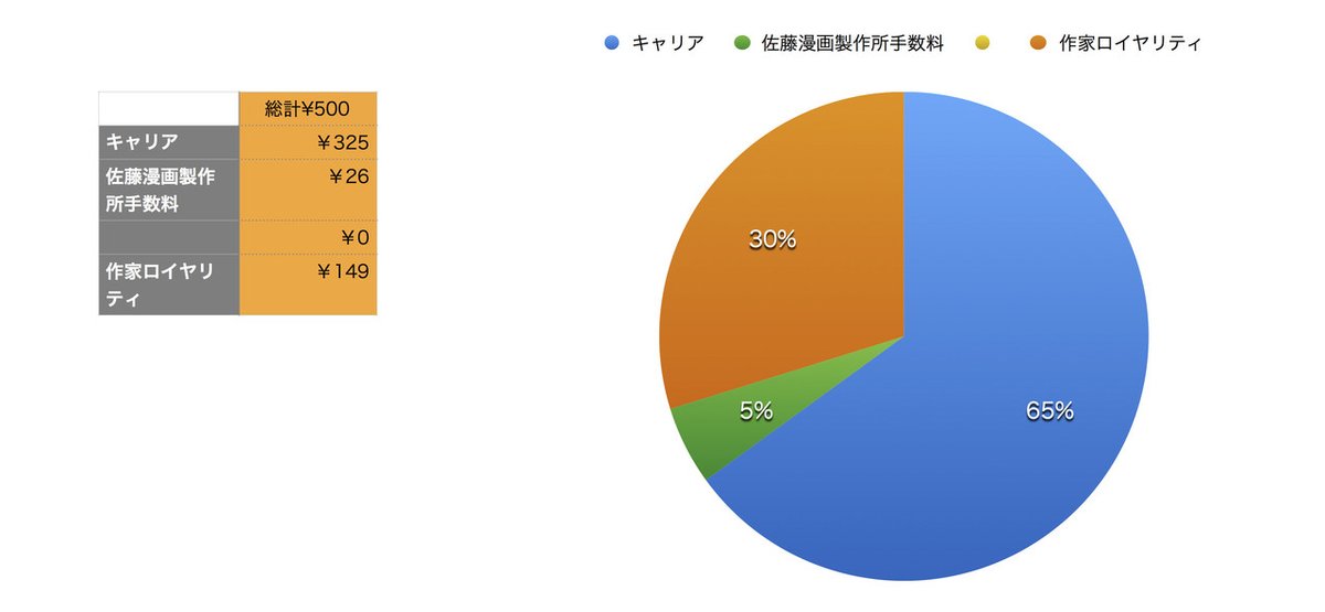 販売総額からキャリアの手数料を差し引き、残ったお金の内15%を佐藤漫画製作所が手数料としていただき、85%を作家にお渡ししております。これまでの実績で言うと、販売総額の約30% を作家にお渡しできています。