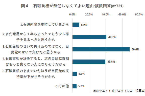 4は石破首相が辞任すると、(例えば高市氏など)保守色の強い政権ができかねないので、石破政権が続くことを望むという考えである。これに近い考えはすでに何人かのリベラル論客からあがっており(例えば古谷氏[i])、ここでも4割近い人が理由として挙げている。立憲民主党・共産党支持者だけに限ると5割近くまで増える。