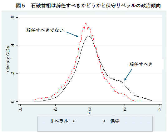 こうして現時点で石破首相に辞めなくてよいと思っているのはリベラル陣営である。これを確かめるために、最後に、石破首相に辞任を求める人と求めない人に分けて、保守・リベラルの政治傾向(思想)の分布を描いてみよう。保守・リベラルの測定方法は前のノートのとおりである。[iv] 図5がその結果である。