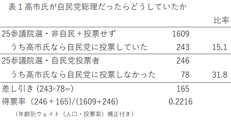 その目論見は実現可能であろうか? 保守票の奪還に最も向いている候補と考えられる高市氏を例に挙げて考えてみよう。今回、自民党に入れなかった人に、参議院選挙でもし総理が高市氏だったら自民党に投票していたかどうかを聞いてみた。また、逆に今回自民党に入れた人に、総理が高市氏だったら自民党に入れるのをやめたかどうかも聞いてみた。高市氏は自民党内で最右派に属するため、嫌う人もいるからである。表1がその結果である。