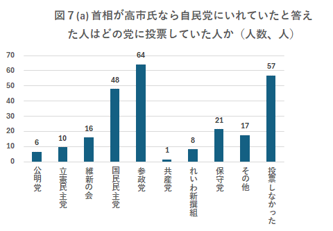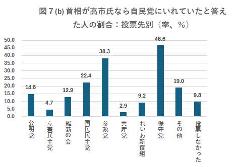 図7(a)を見ると参政党と国民主党が多くて、50~60人に達している。投票に行かなかった人も高市氏なら50人程度が高市氏に投票すると言っており、この3つで6割を占める。図7(b)の投票先での比率でみると、国民民主党・参政党がやはり高いが、保守党がさらに高くなっている。国民民主党の投票者の2割程度、参政党投票者の4割弱、そして保守党投票者の5割弱が高市氏が総理なら自民党に投票していたと答えている。この比率は非常に高い。自民党から離れた岩盤保守層が、国民民主、参政、保守の3党に移動していることをうかがわせる。高市氏が総裁になって選挙を戦えば保守票は取り戻せそうである。