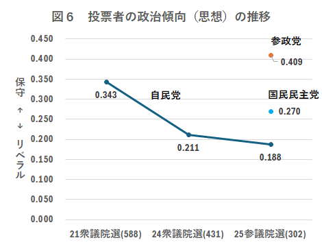 4年前の衆議院選挙で自民党に投票した588人の保守度は0.343であった。昨年の衆議院選挙の時の投票者(431人)の保守度は0.211に低下し、今年の参議院選挙の投票者(302人)では0.188にまで低下した。この間、比例区で自民党に投票する人の数は588人→431人→302人と一貫して減っており、得票率の減少とともに保守度は低下を続けた(0.343→0.211→0.188)。この調査で個人の政治傾向は変わっていないので、これは自民党の岩盤保守層が自民党から離れて他の党に移動したためと考えるしかない。