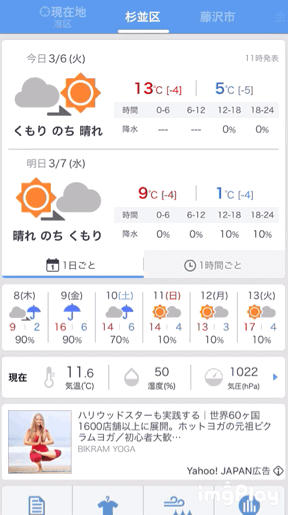 1画面に最低限の情報が詰まっており、1時間ごとの天気が見やすい。また、横スワイプで、家の地域の天気と大学の地域の天気が切り替えられるところがとても便利です。