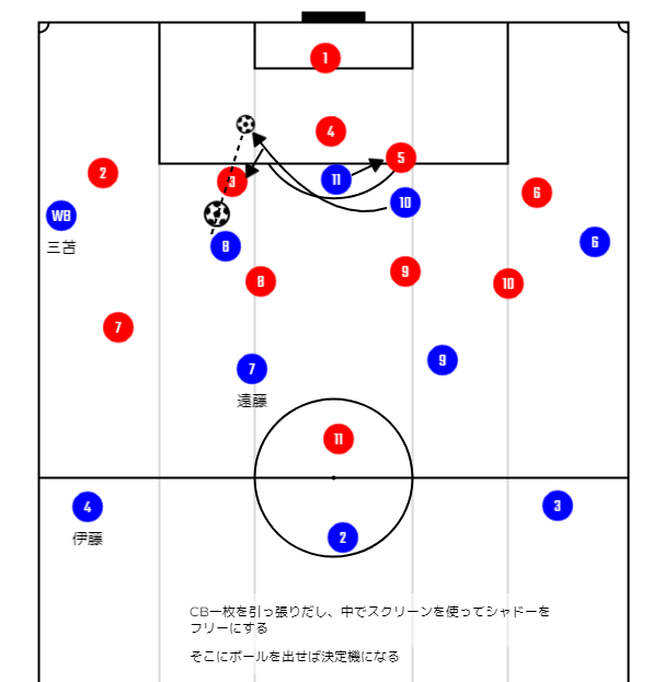 ãããªæãã§æ±ºå®æ©ã«ç¹ãããã¾ãããã®ã±ã¼ã¹ã§ã¯ããã¼ã«æã£ãã·ã£ãã¼ã«CBãé£ãã¤ãã¾ãããããã®è£ã®ã¹ãã¼ã¹ã空ãã¾ãããã®è£ã«ãã䏿ã®ã·ã£ãã¼ãèµ°ãã¾ãããã®æã«ã·ã£ãã¼ããã¼ã¯ãã¦ãCBã«CFãã¹ã¯ãªã¼ã³ããã¦ãã¼ã¯ãå¥ããã¾ããããã¦ããªã¼ã«ãªã£ãã·ã£ãã¼ã«ãã¼ã«ãéãã°GKã¨ã®ä¸å¯¾ä¸ãä½ãã¾ãã