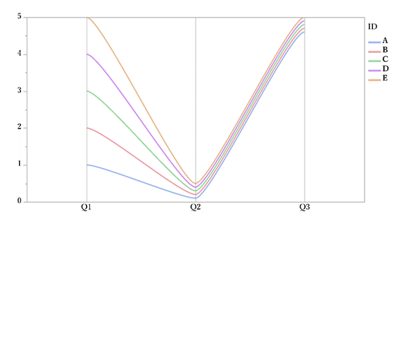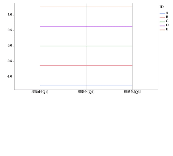 平行軸プロットのスケールに恣意性があるのは、平行軸プロットというグラフのもつ性質である。図1のように元データをプロットした場合、Q2とQ3における相対的な違いを矮小化することになる。図2のように中心化したデータをプロットした場合、Q2やQ3の位置の情報を失うことになる。図3のように標準得点をプロットした場合、位置の情報だけでなく、Q1に比べてQ2とQ3の絶対的なばらつきが小さいという情報も失う。