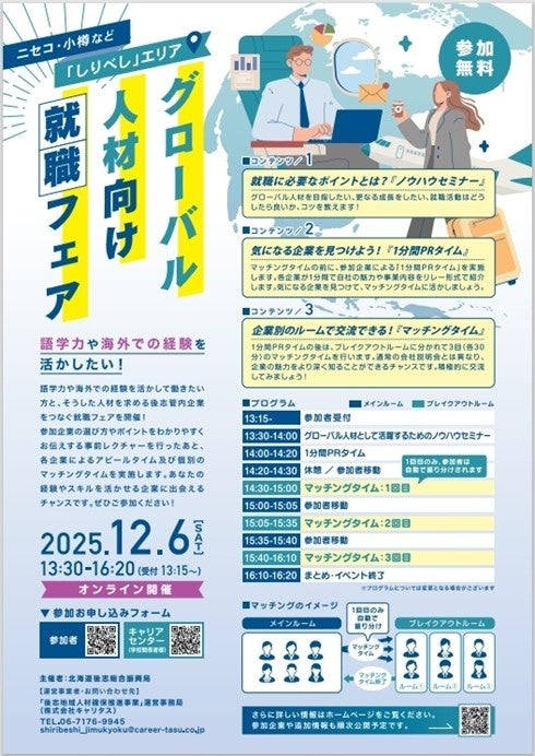 北海道後志総合振興局では、語学力などを活かした就職・転職を希望する方を対象とした「グローバル人材向け就職フェア」を開催いたします。(事業受託:株式会社キャリタス)