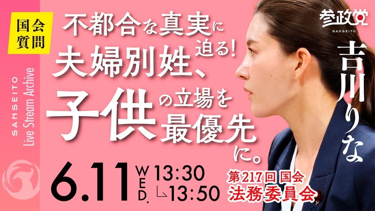 【国会6/11】 不都合な真実に迫る!夫婦別姓、子供の立場を最優先に。|参政党・吉川りな