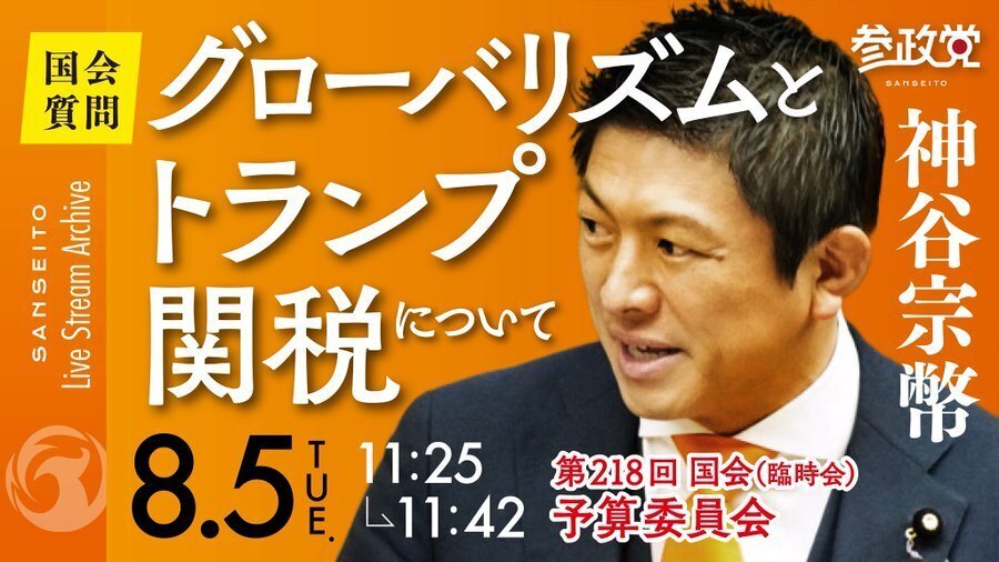【国会 8/5】 グローバリズムとトランプ関税について|参政党・神谷宗幣