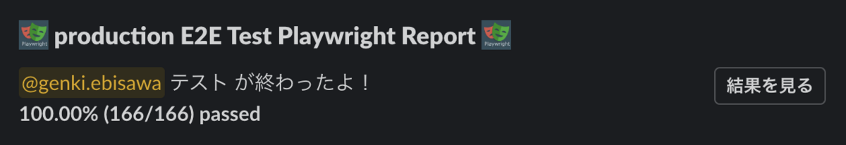 上記コマンドでデプロイ -> E2Eテスト開始通知 -> E2Eテストの実行が行われます。テストの実行が完了すると下記のようにテスト結果レポートが通知されます。