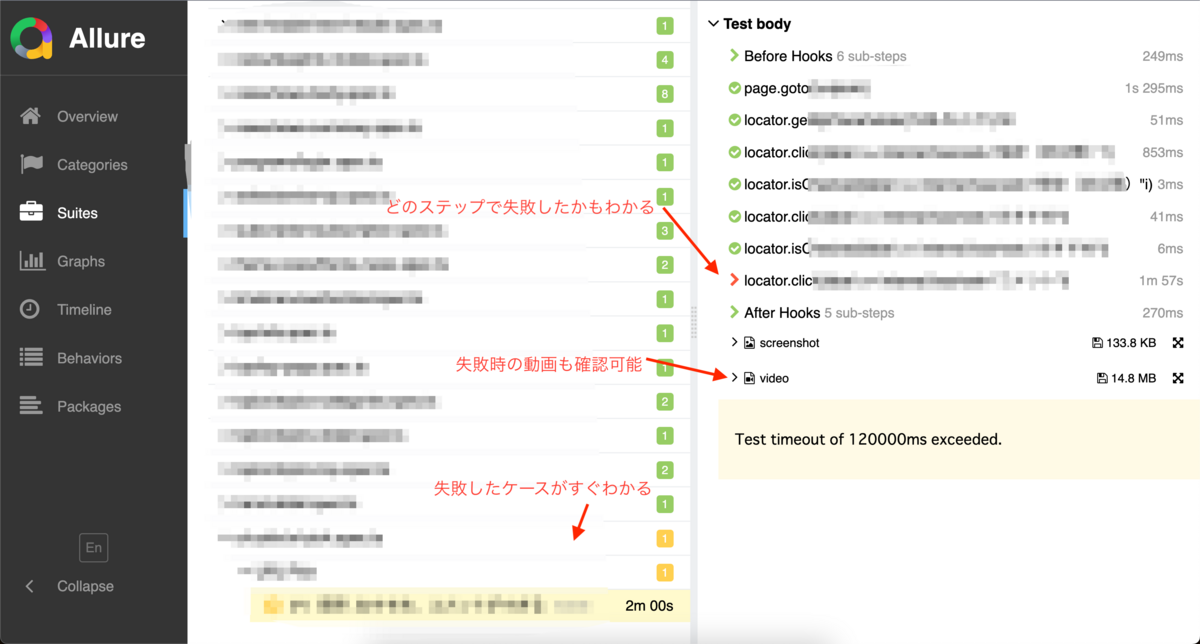 allure report はとても見やすく、テスト数や所要時間も表示できます。