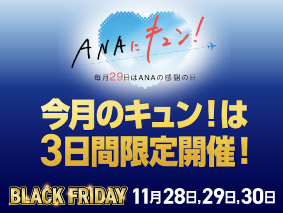 ANA Xは、毎月29日の月替わりキャンペーン「ANAにキュン!」について、11月の実施内容を一部公開した。今月は「ANAブラックフライデー」と連動し、実施期間を通常よりも長い11月28日~30日の3日間に拡大して行なう。