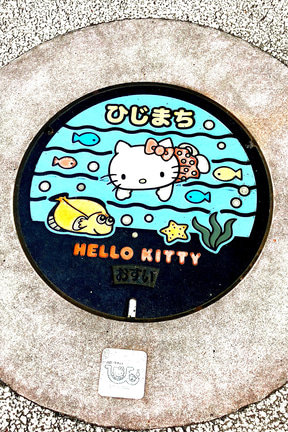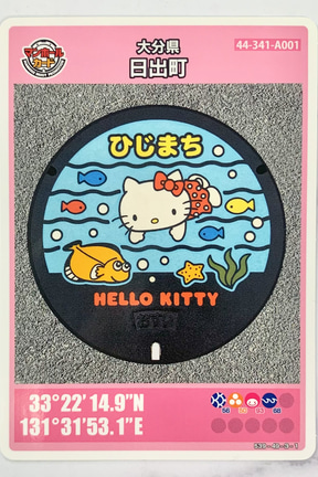 町内のさまざまな場所にハローキティやサンリオキャラクターの装飾が施されており、日出町役場近くのこちらのかわいいマンホールカードも受け取ることができます。