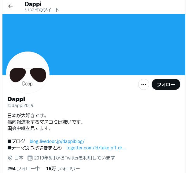 ç¥ããªã人ããããããããªãã®ã§ä¸å¿èª¬æãã¦ããã¨ãDappiï¼@Dappi2019ï¼ã¨ããã®ã¯ãèªå ¬æ¿æ¨©ã䏿¹çã«æè·ãã左派ã»ãªãã©ã«ãæ»æããããã°ããæµãã¦ãããTwitterã®ã大ç©ããã¦ã¨ãã¢ã«ã¦ã³ãã§ããã